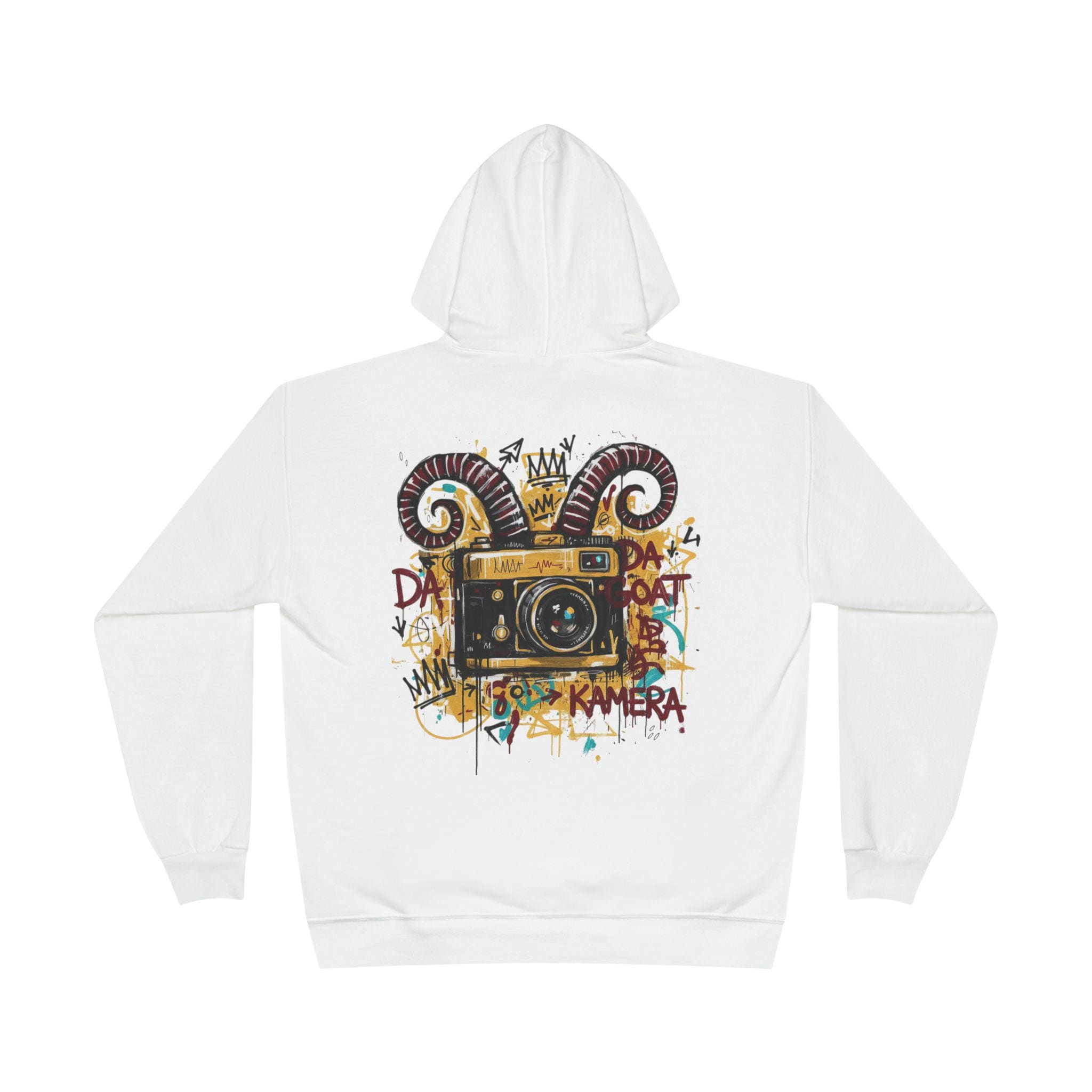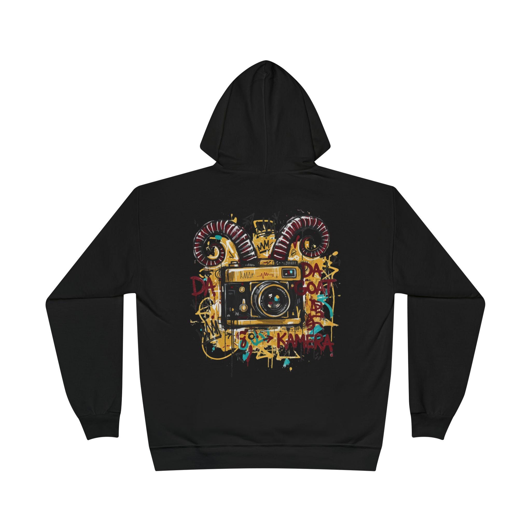 Soft, lived-in warmth with an edge. This hoodie settles around your shoulders like an echo of late-night city walks and sunlit rooftop photo sessions. The front keeps things minimal with a small, hand-script monogram; the back bursts with a gritty, artful camera montage framed by twisting horns and paint splatters. It feels like your favorite film-photo zine brought to life — cozy fleece for cool mornings, bold artwork for when you want to be seen. Wear it on dawn shoots, coffee-run afternoons, or when swapping prints with fellow image-makers. The relaxed fit and roomy kangaroo pocket make it easy to layer over tees or a light flannel, while the recycled polyester content and tubular knit speak to people who care about materials as much as mood.