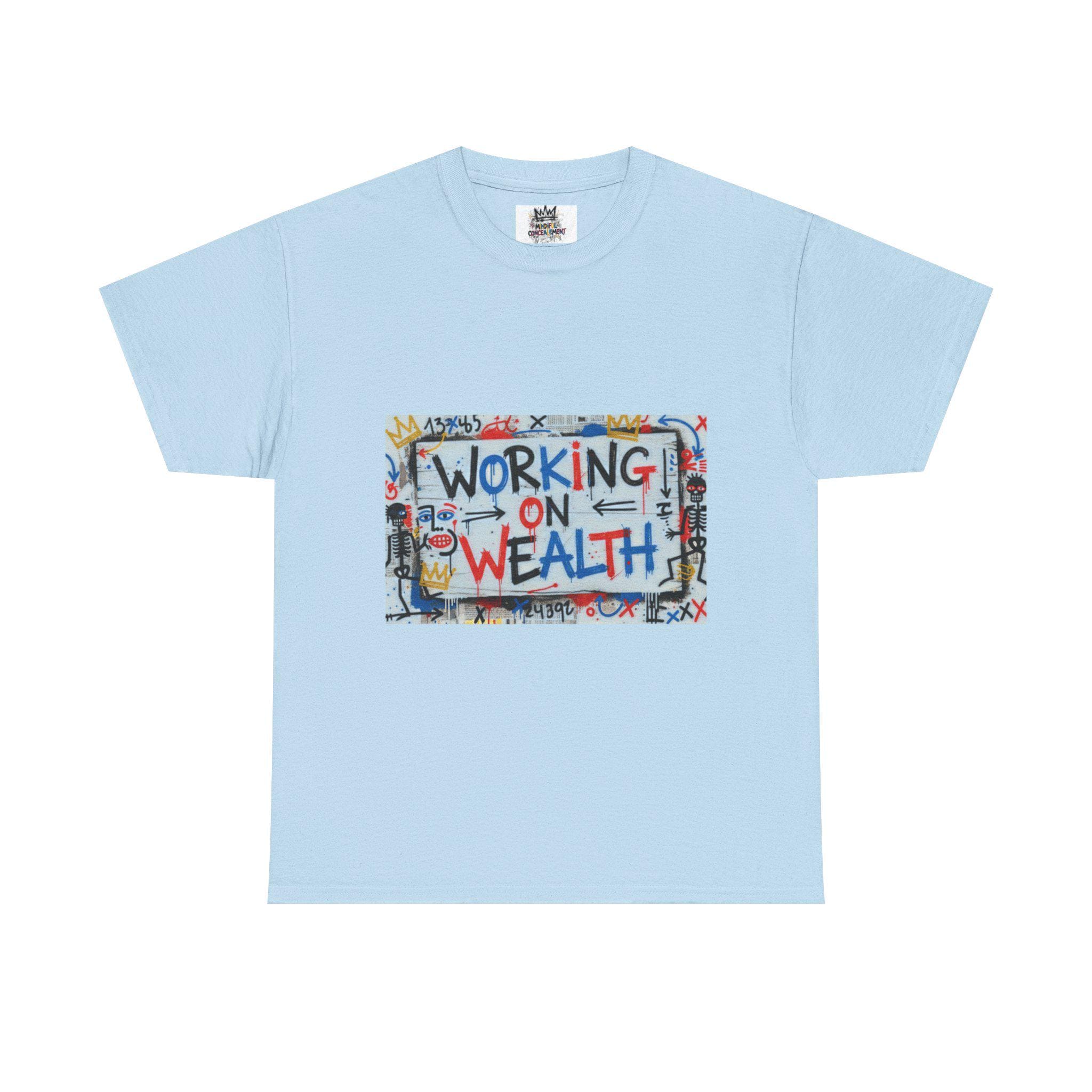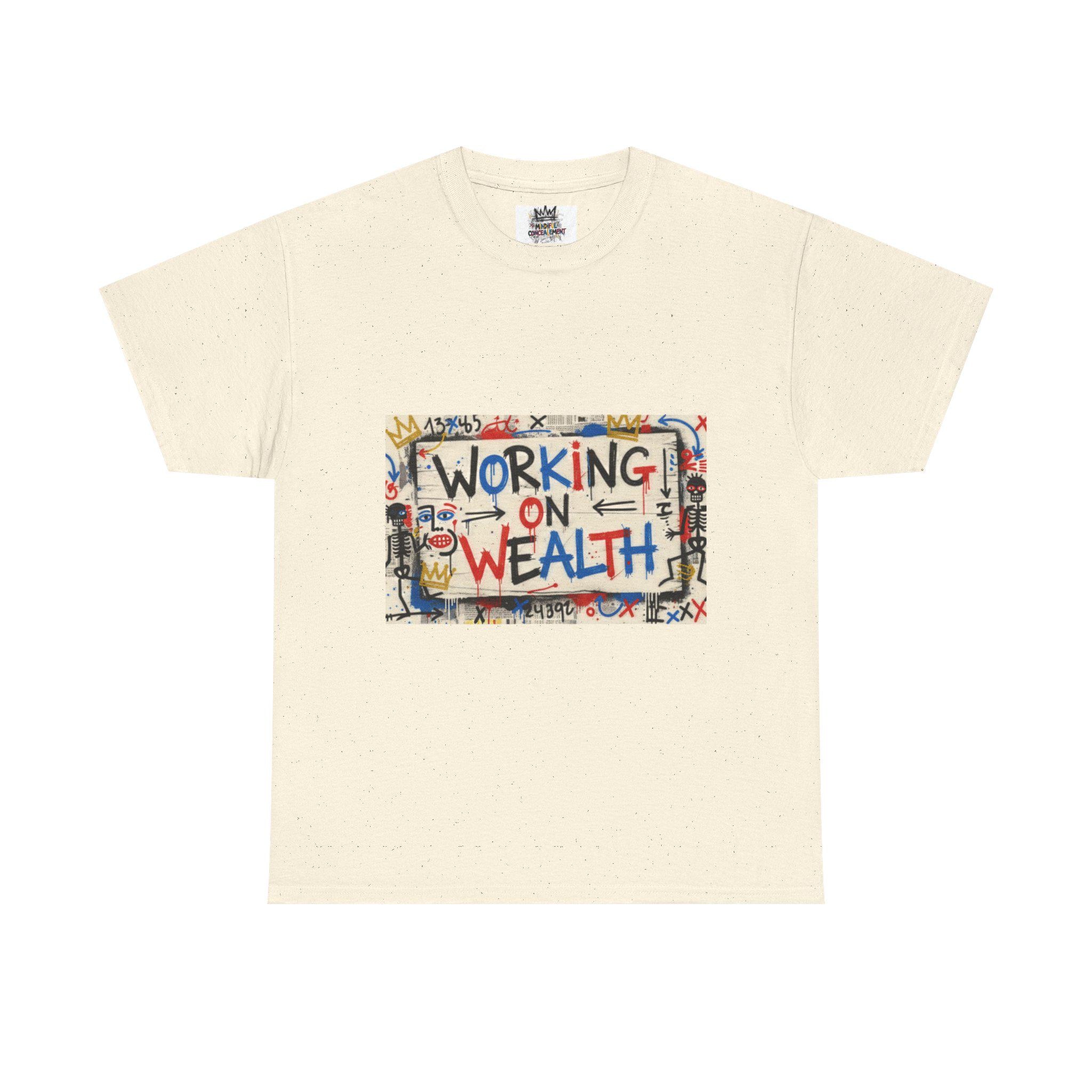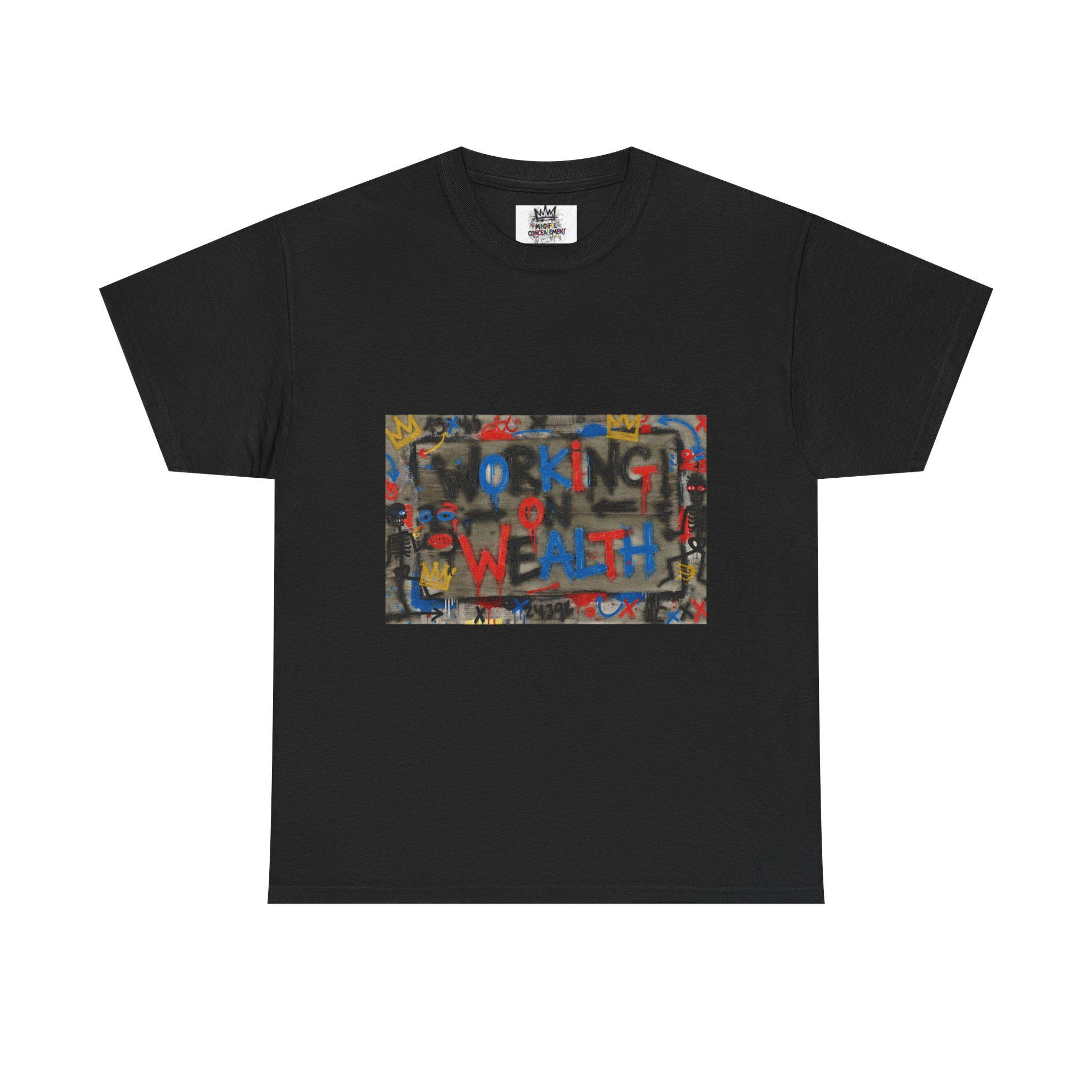 This classic cotton tee wears like a quiet declaration. The front print — playful, hand-lettered graffiti reading “WORKING ON WEALTH” — sits like a badge of hustle over a backdrop of colorful street-art marks. It feels like a snapshot from a city alley: gritty texture, bright accents, and an unapologetic sense of motion. Lightweight yet sturdy, the shirt layers easily under jackets or stands alone with rolled sleeves. Wear it on long days of building, at casual meetups with fellow creators, or when you want to carry a bold, motivated statement without shouting. The tone is confident and earnest—made for people who treat progress as a daily practice.