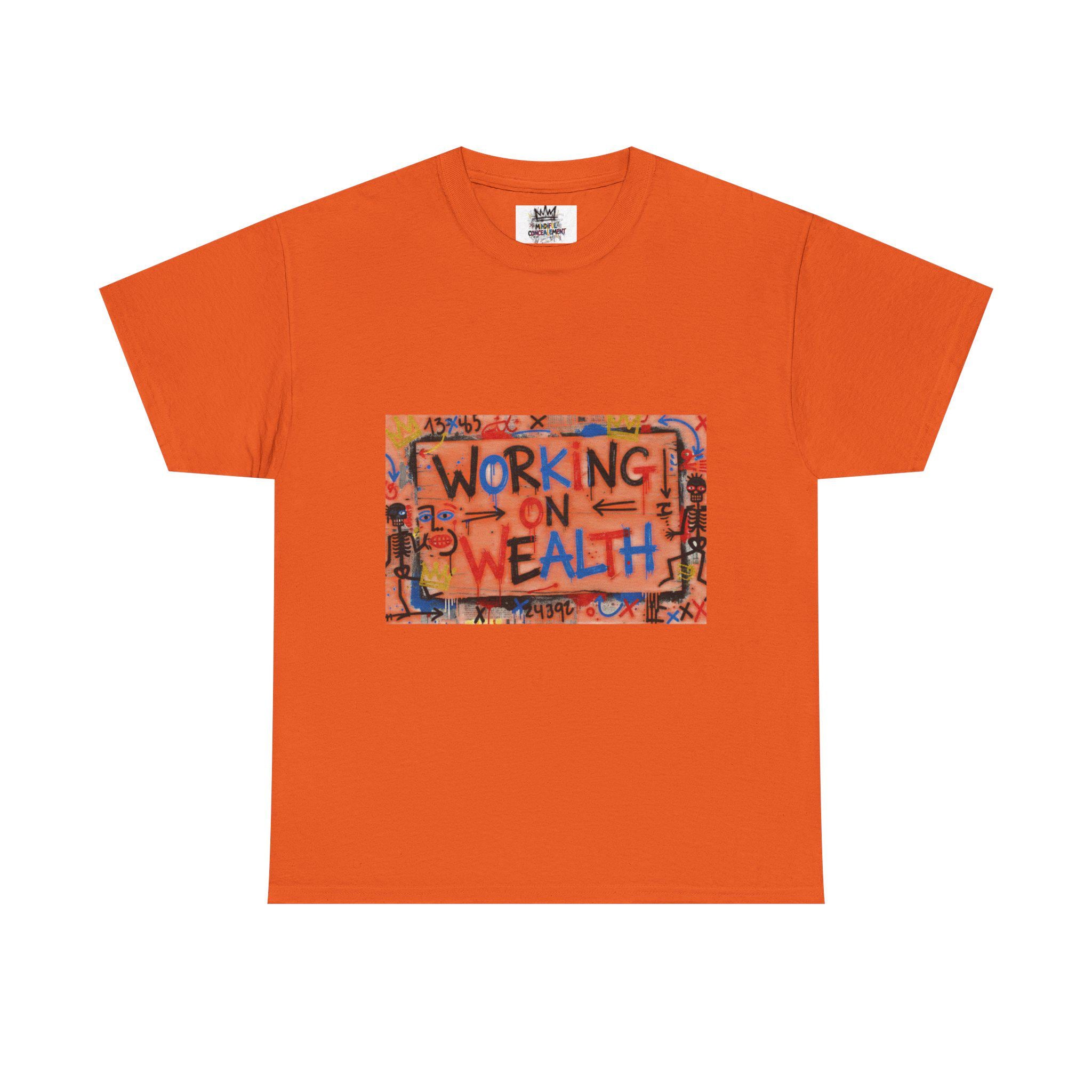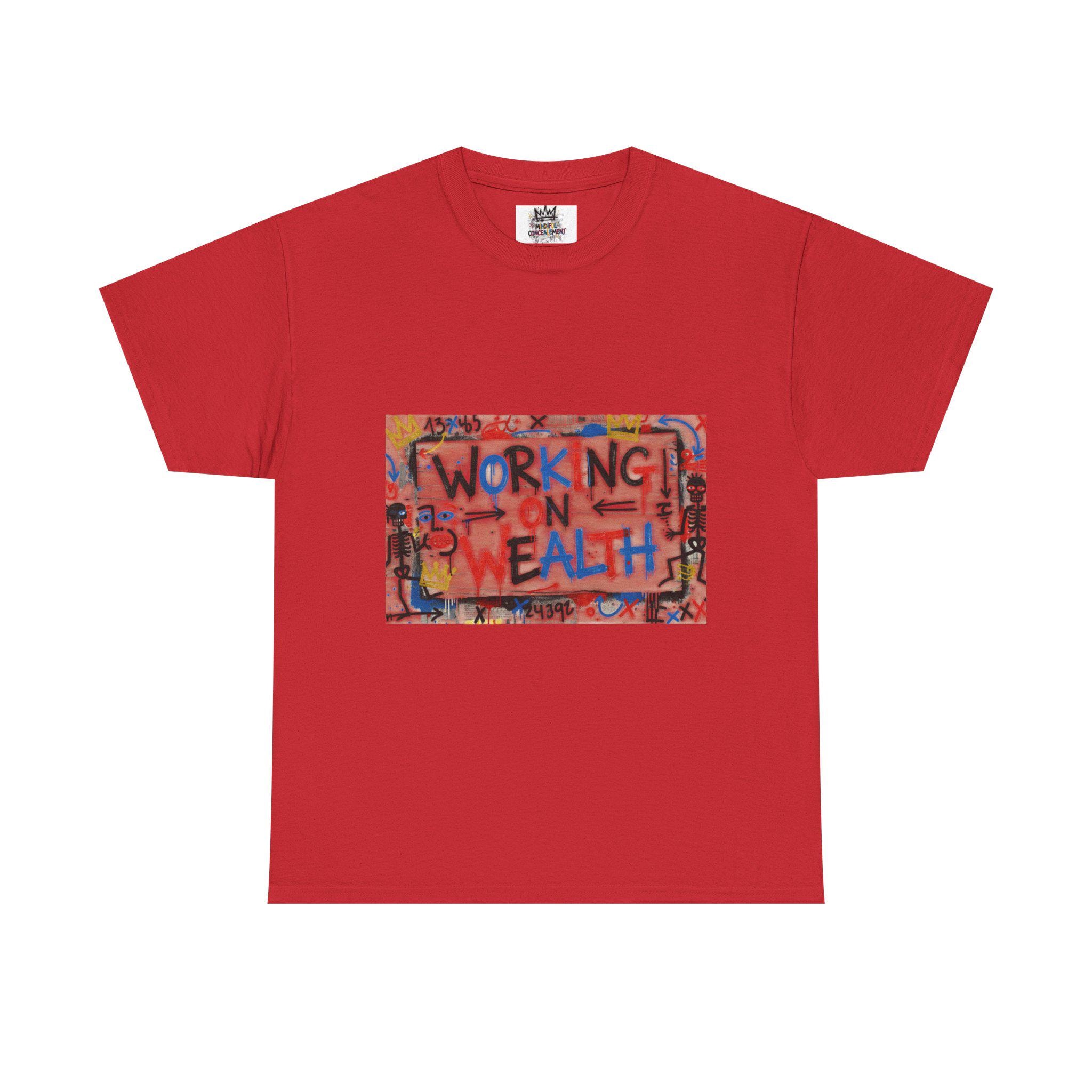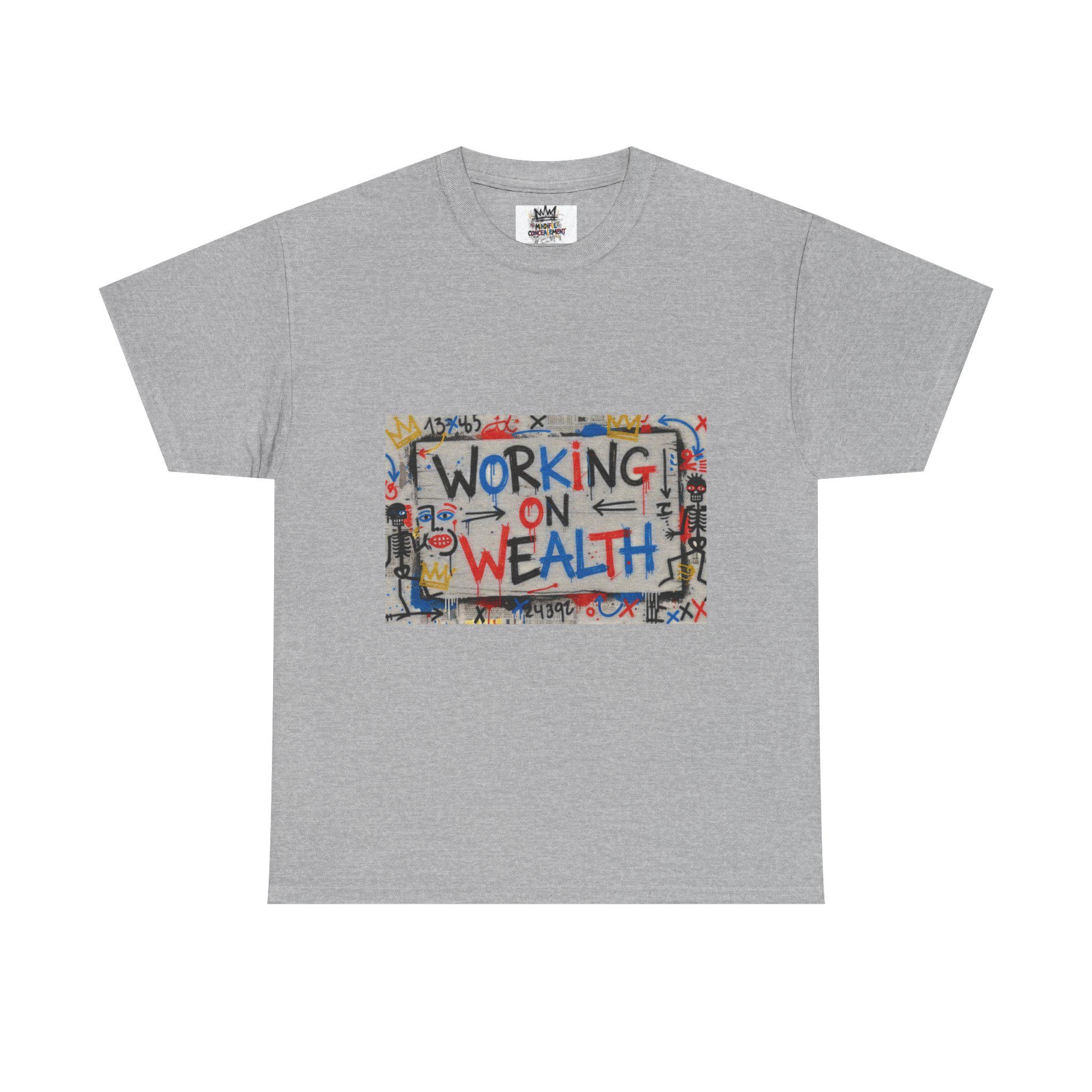 This classic cotton tee wears like a quiet declaration. The front print — playful, hand-lettered graffiti reading “WORKING ON WEALTH” — sits like a badge of hustle over a backdrop of colorful street-art marks. It feels like a snapshot from a city alley: gritty texture, bright accents, and an unapologetic sense of motion. Lightweight yet sturdy, the shirt layers easily under jackets or stands alone with rolled sleeves. Wear it on long days of building, at casual meetups with fellow creators, or when you want to carry a bold, motivated statement without shouting. The tone is confident and earnest—made for people who treat progress as a daily practice.