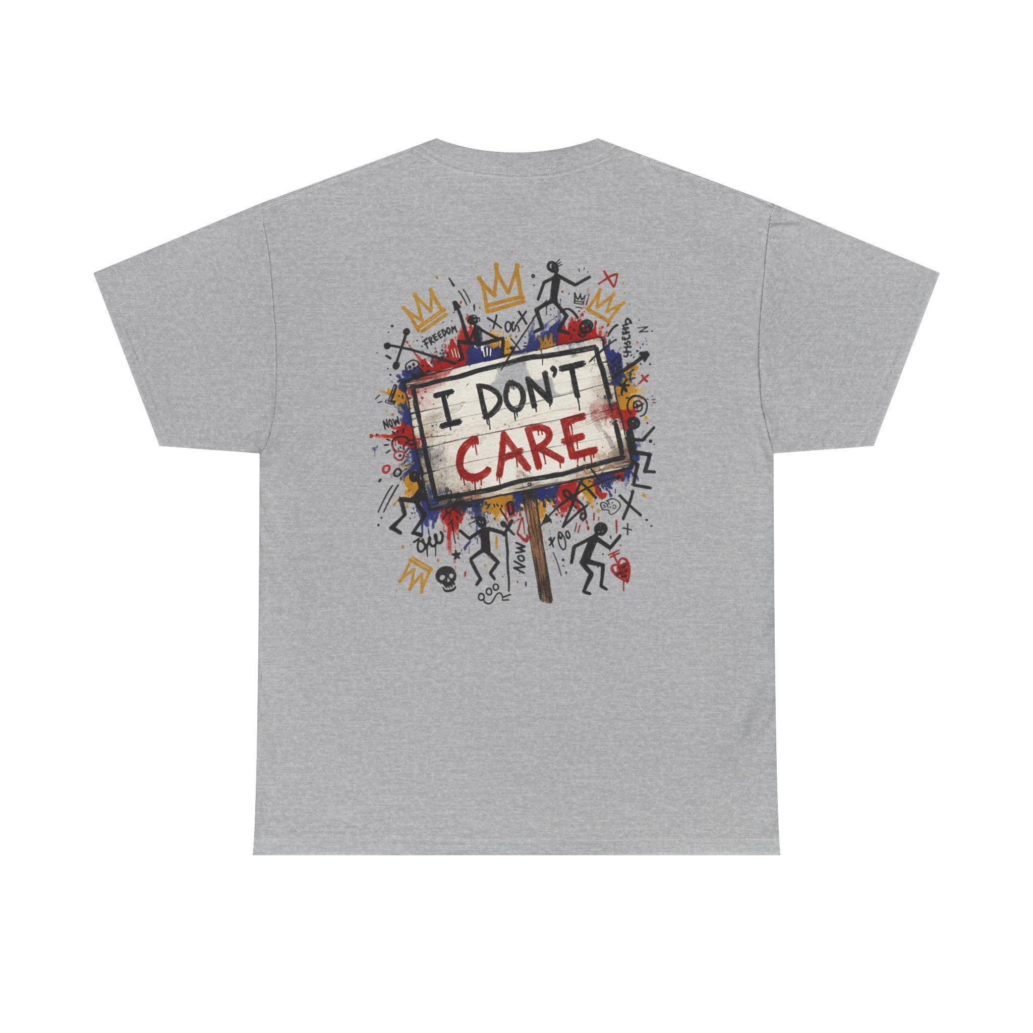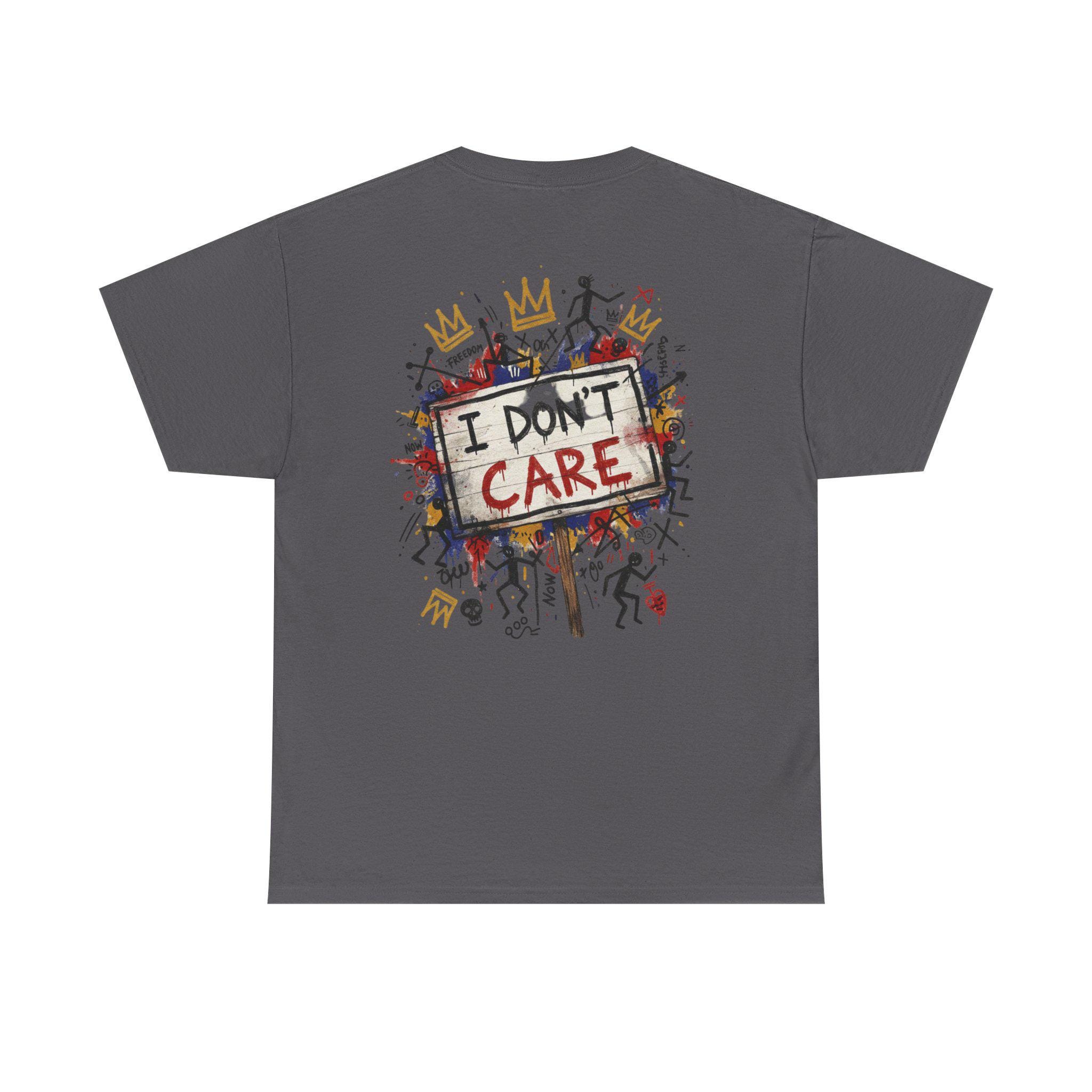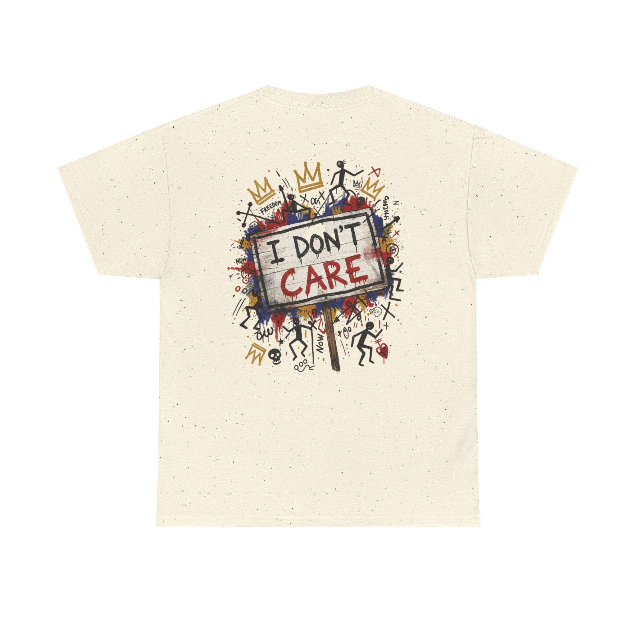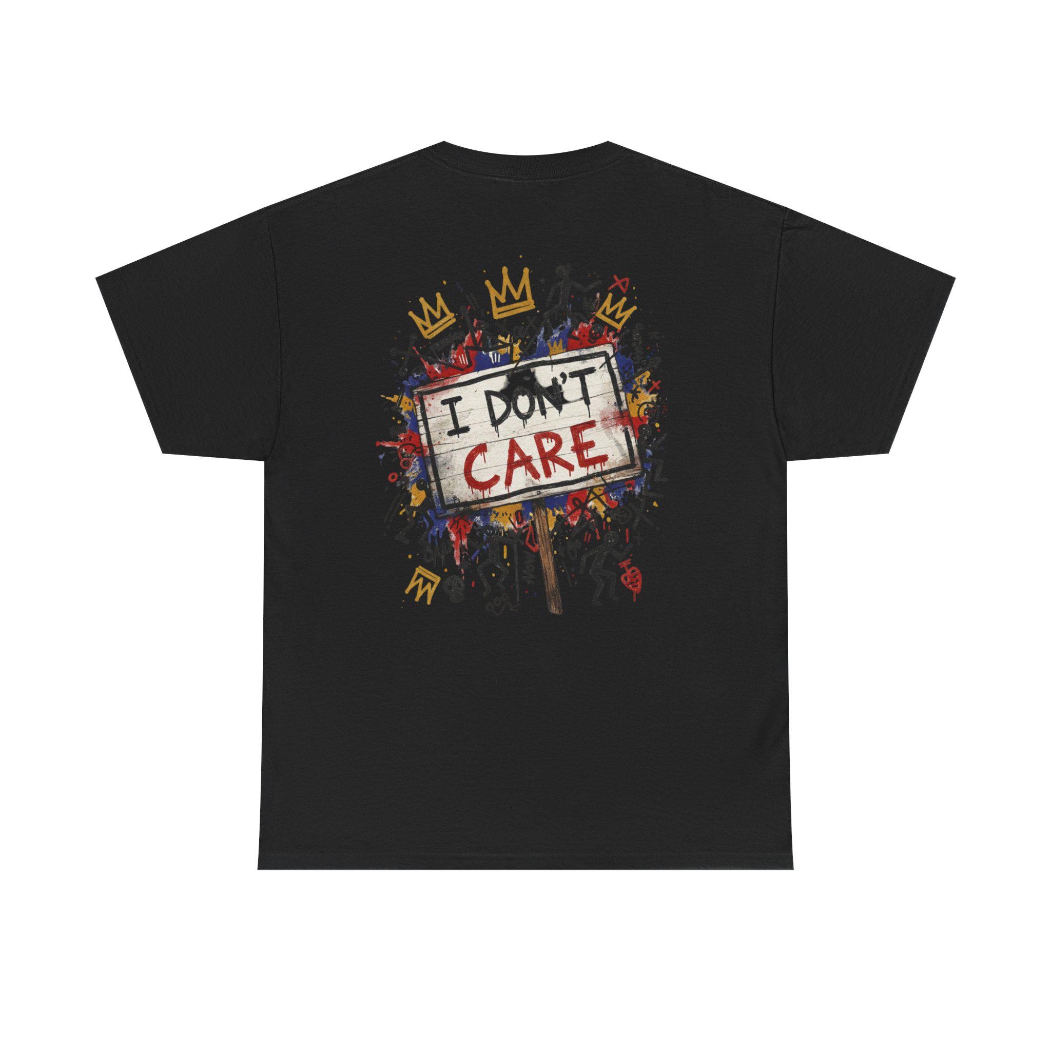 This classic cotton tee wears like a statement. The front bursts with bold, graffiti-style letters—SHHH—in primary colors, layered over playful doodles and paint splatters. The back carries the same streetwise voice: a hand-painted protest sign reading “I DON’T CARE,” surrounded by tiny characters, crowns, and scribbled marks. It feels like a late-night mural come alive—raw, a little rebellious, and full of personality. Wear it when you want your look to speak in jokes and eye rolls, when you’re roaming the city, sketching in a café, or meeting friends at an underground show. The soft, sturdy fabric and neat crew neckline keep the focus on the art while letting you move easy and stay comfortable all day.