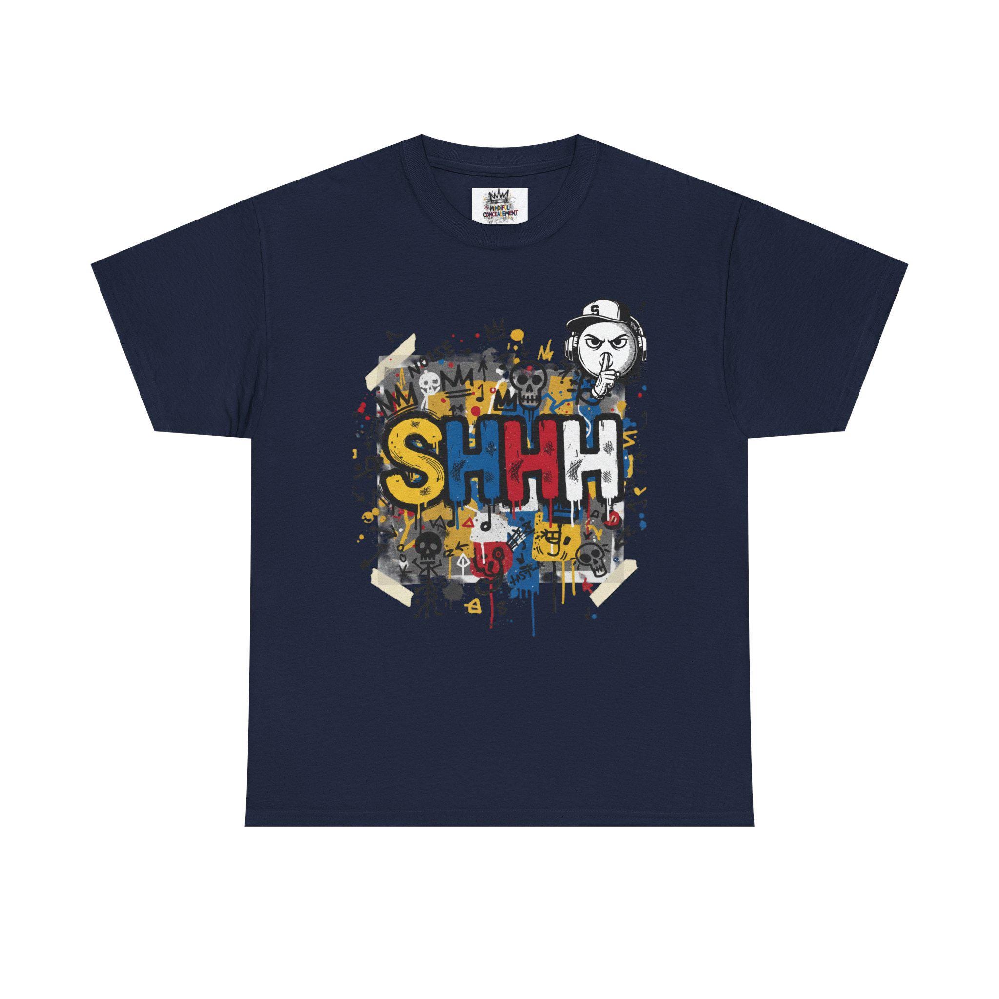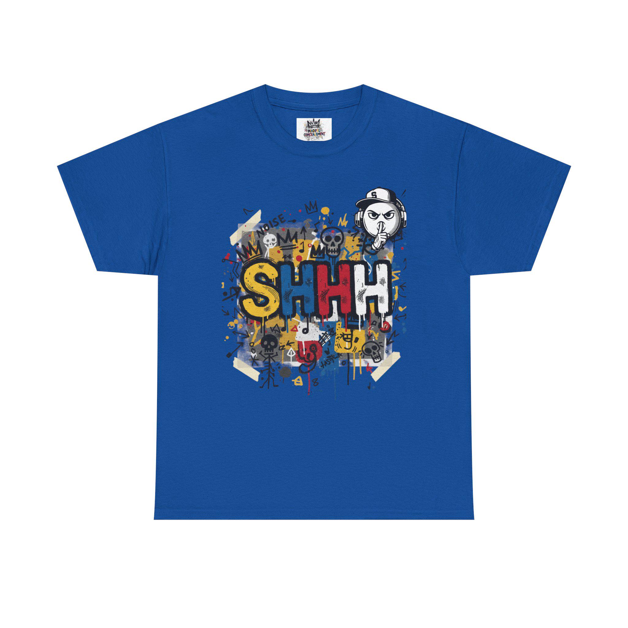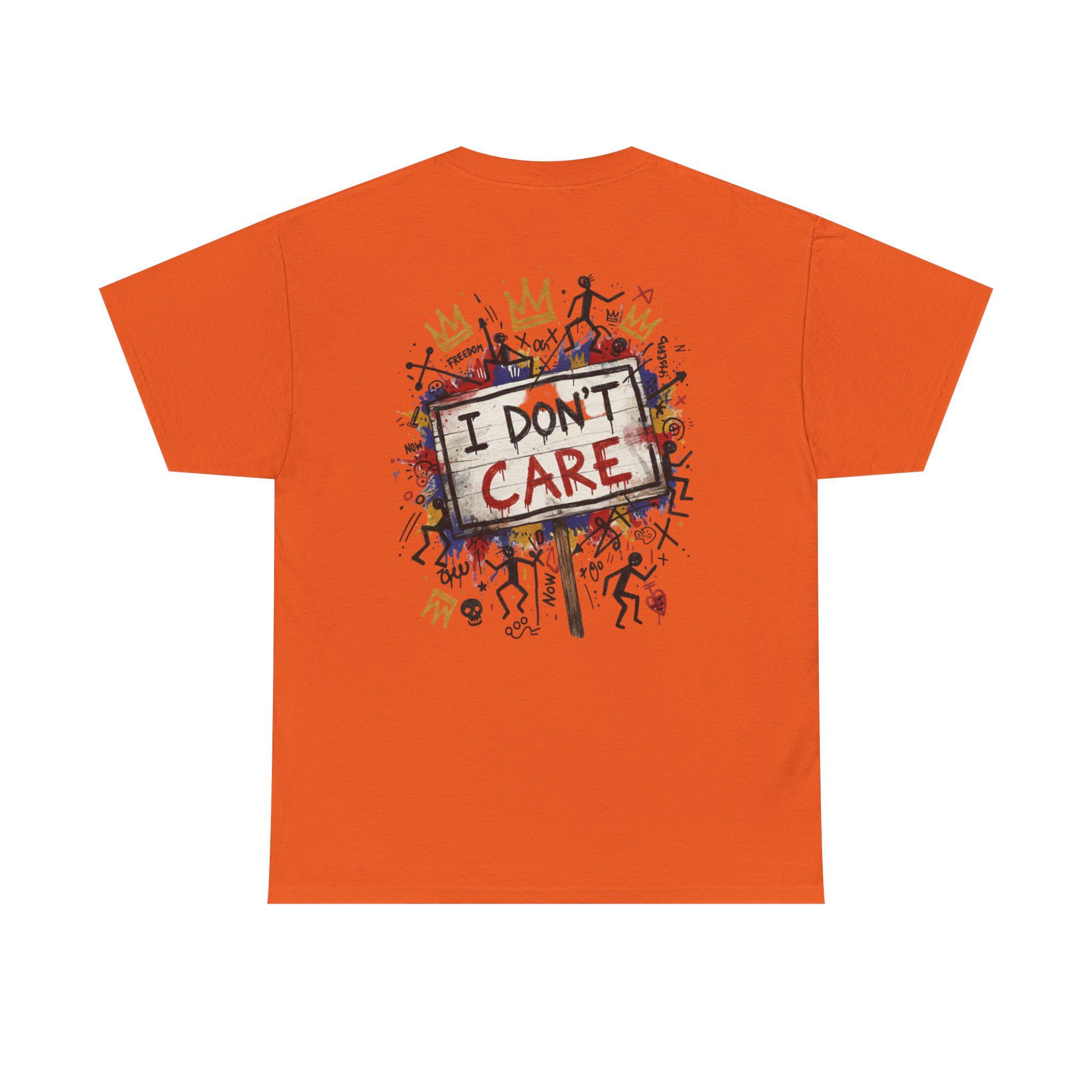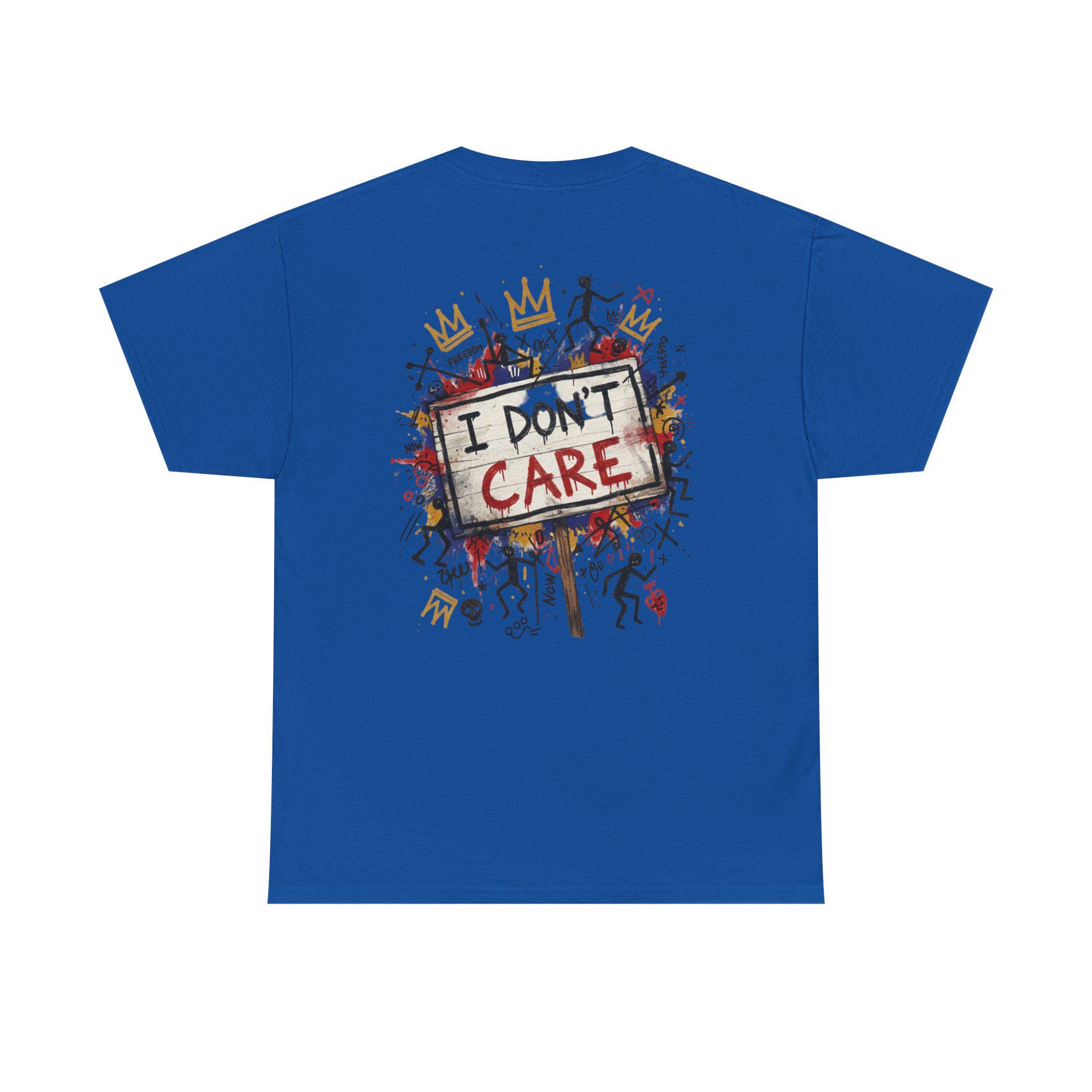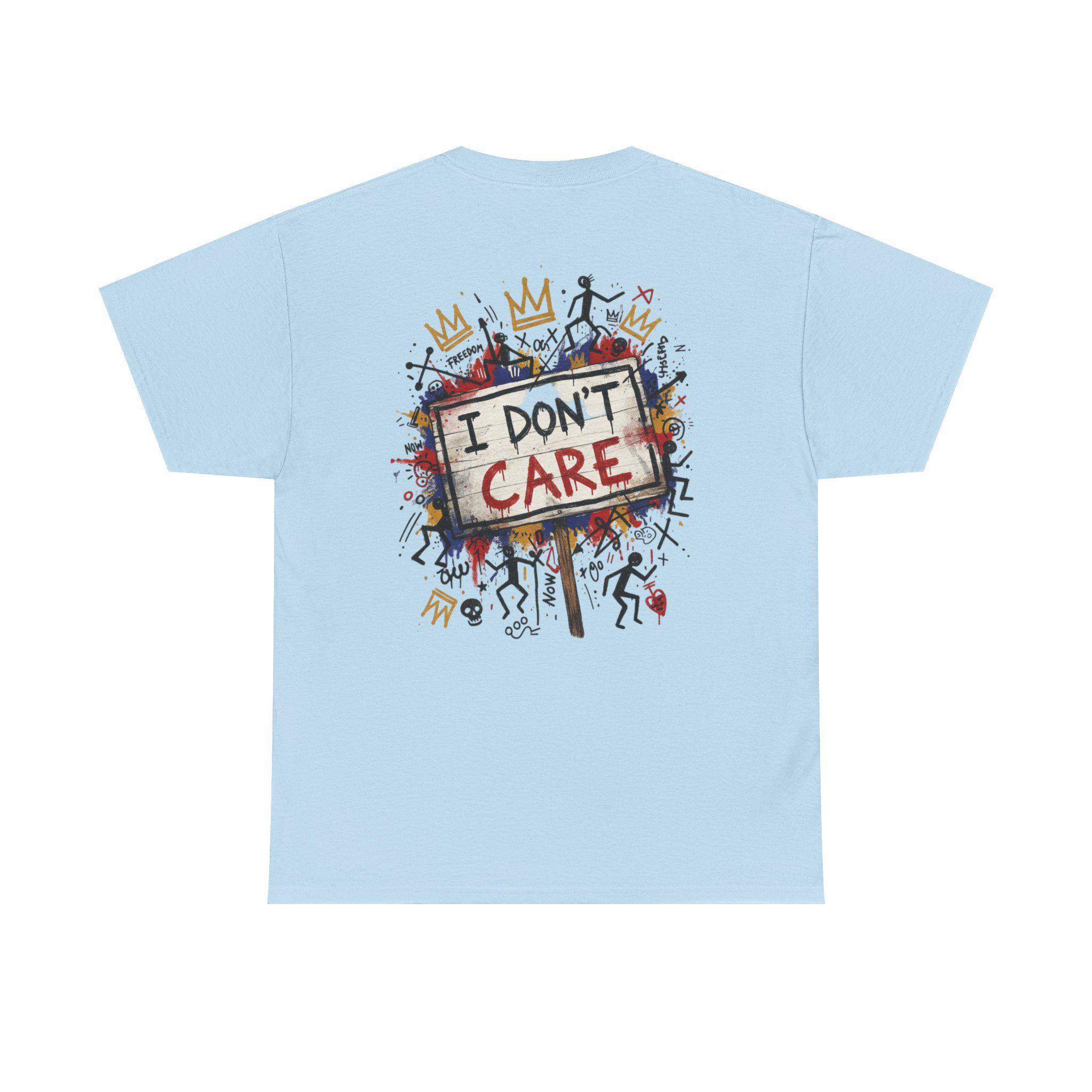 This classic cotton tee wears like a statement. The front bursts with bold, graffiti-style letters—SHHH—in primary colors, layered over playful doodles and paint splatters. The back carries the same streetwise voice: a hand-painted protest sign reading “I DON’T CARE,” surrounded by tiny characters, crowns, and scribbled marks. It feels like a late-night mural come alive—raw, a little rebellious, and full of personality. Wear it when you want your look to speak in jokes and eye rolls, when you’re roaming the city, sketching in a café, or meeting friends at an underground show. The soft, sturdy fabric and neat crew neckline keep the focus on the art while letting you move easy and stay comfortable all day.