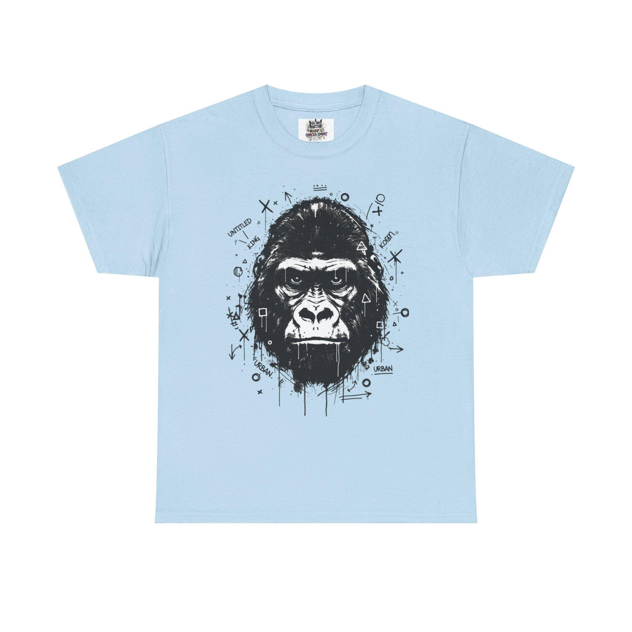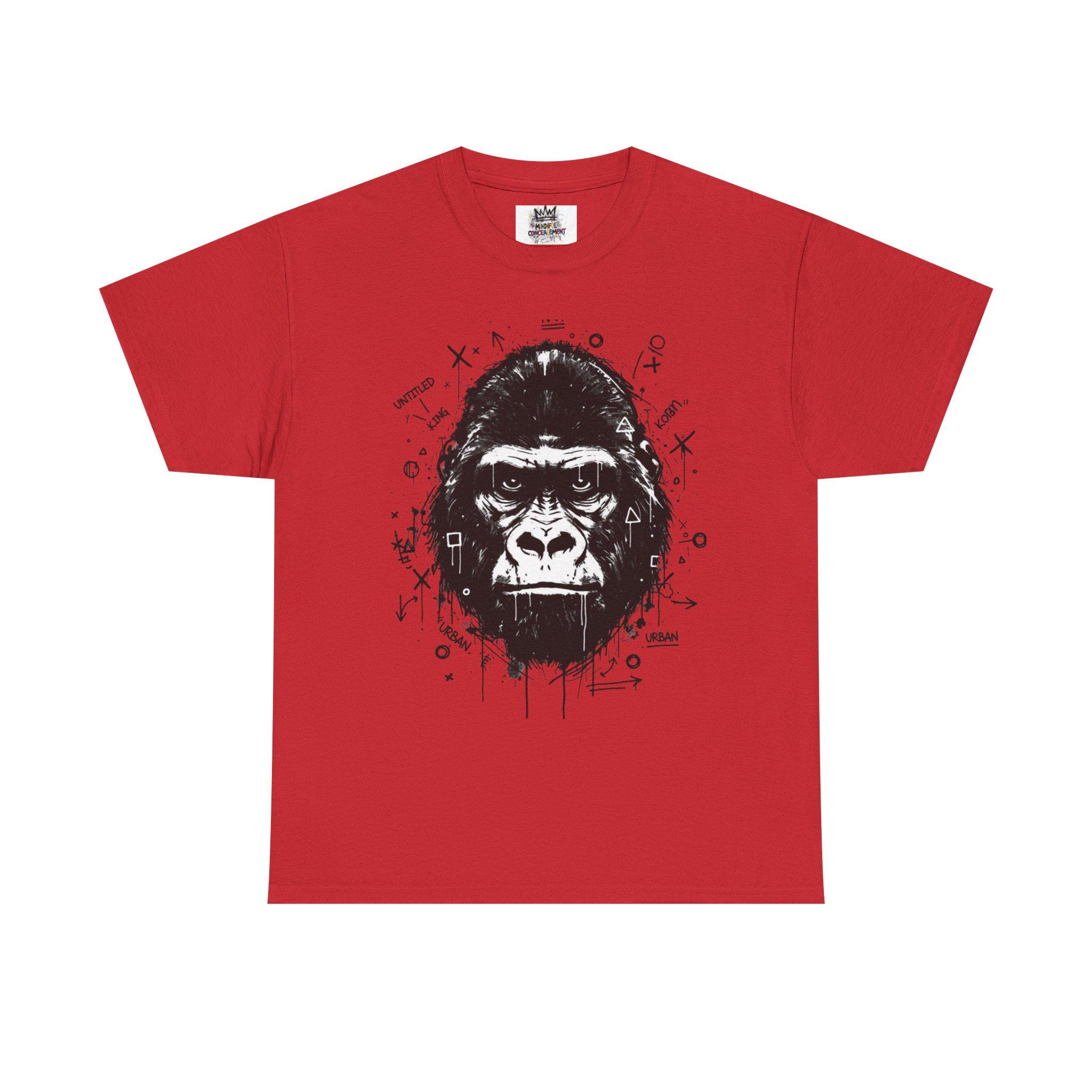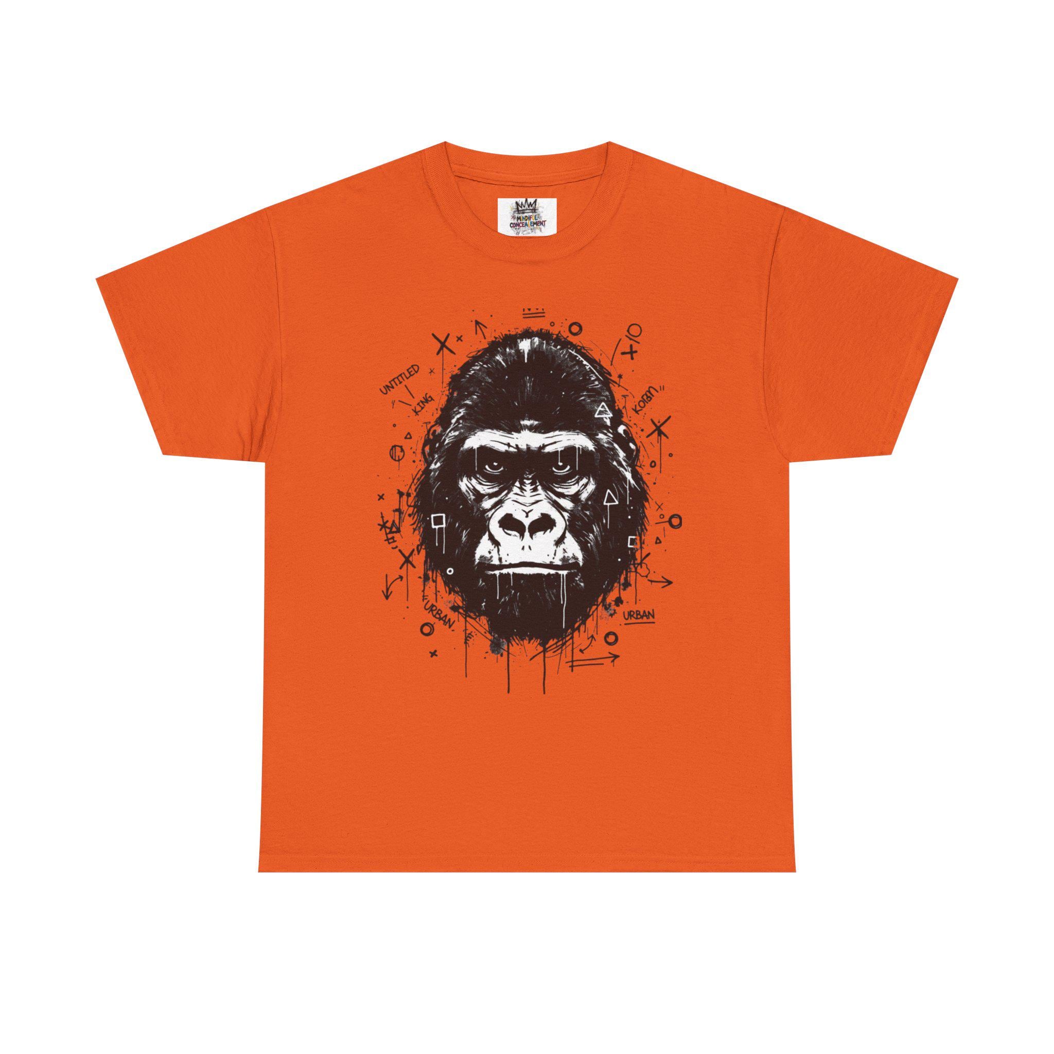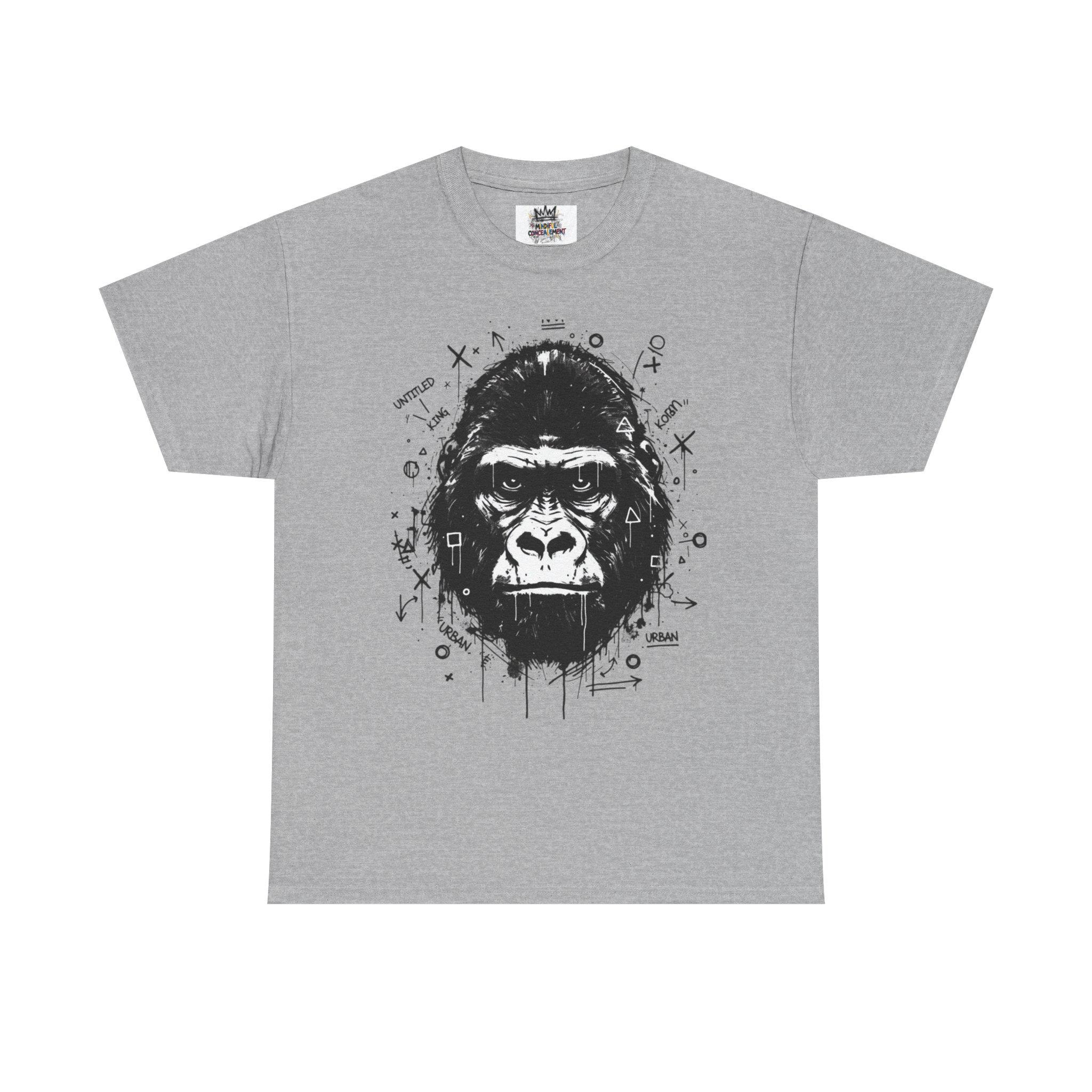 A bold, expressive tee that puts a striking gorilla portrait front and center. The high-contrast black illustration reads like urban street art — raw brushstrokes, schematic markings, and subtle drips give it a gritty, handcrafted edge. Worn by someone who likes statement graphics and minimalist palettes, this shirt pairs easily with layered streetwear or a simple denim jacket. It sits comfortably on the body with a classic crew neckline and relaxed fit, and the smooth, strong cotton holds print detail sharply so the design stays crisp after washes. Ethically sourced cotton and thoughtful construction (tubular knit, reinforced shoulder tape, and a tear-away label) keep this tee feeling reliable and lived-in from the first wear.